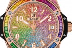 Hublot sets its Big Bang watch models with all the colors of the rainbow, enriching Isaac Newton’s seven hues with the magenta radiance of pink sapphires. Its dial boldly flaunts a chromatic bezel composed of 48 baguette-cut gems.