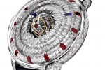 The minute disk is set with 119 White Diamonds (≈ 6.80 ct.) and one red ruby to indicate the exact minute. The hour disk is also with 119 White Diamonds (≈ 7.93ct.) and one red ruby (≈ 0.28ct.) to show the hours. The 50mm 18K white gold case features a special domed sapphire crystal with anti-reflective treatment to show off the diamonds and the tourbillon, and the bezel inner ring is also set with gems — 12 Blue Sapphires (≈ 1.49ct.) and 108 White Diamonds (≈ 4.56ct.).