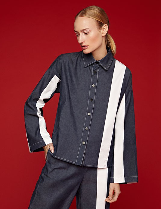 Among the recurring creative elements used within the collection for YOOX, Choi has opted for the stripe, which graphically brings to mind the bar code, a symbol of modern consumption, and has been thoughtfully adopted because, in production, assembling stripe patterns allows for less waste during pattern cutting of the fabric.