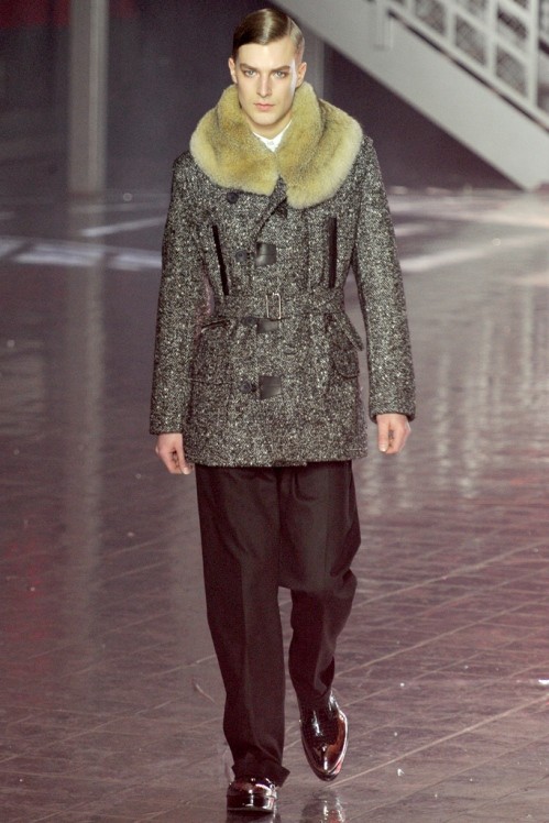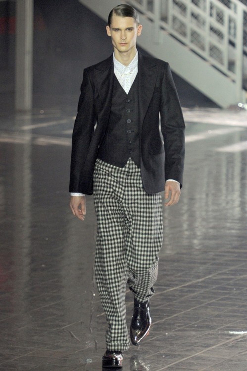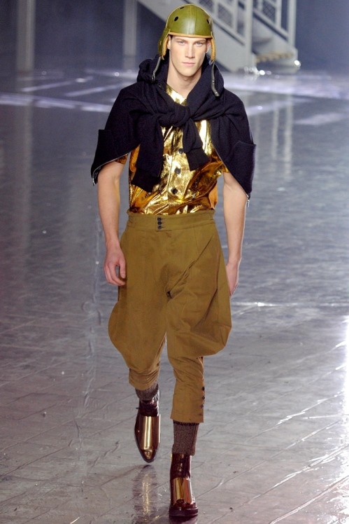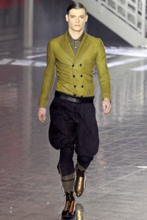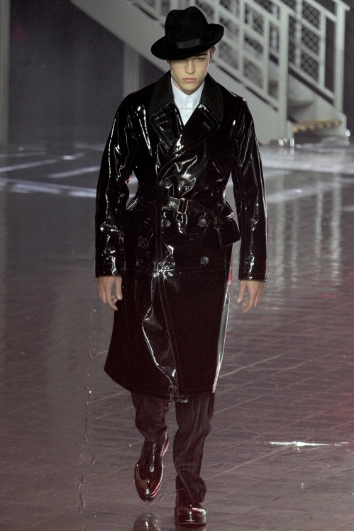 John Galliano Menswear Fall/Winter 2012/13 collection was inspired by the 1920s prohibition era and presented the most recognisable characters. First, the classic stereotype of the gangster in double breasted, fur edged coat and fedora hat then the foot soldiers, in plus fours and helmets, took to the catwalk.