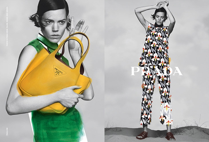 The images and campaign films combine hand-painted watercolors with digital artistry. David Sims’ black and white images of Freja Beha Erichsen act as monochrome canvasses for a subsequent intervention, creative expression via saturated color, applied with improvised spontaneity over the image. The silhouettes of the clothes, their seams and patterns, become ‘paint by numbers’ frames for energetic explorations of color – a dozen Prada-ist shades of Celeste blue, pink, yellow, orange, green and more.