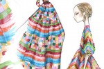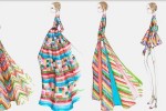 Inspired by an iconic print from a 1973 Valentino show, the ready-to-wear collection boasts three ankle-skimming tulle gowns and one cocktail dress in either an eye-catching multi- coloured pattern of bold chevrons or stripes and embellished with sequins, or, for a more classic look, solid shades with on-tone sequins.