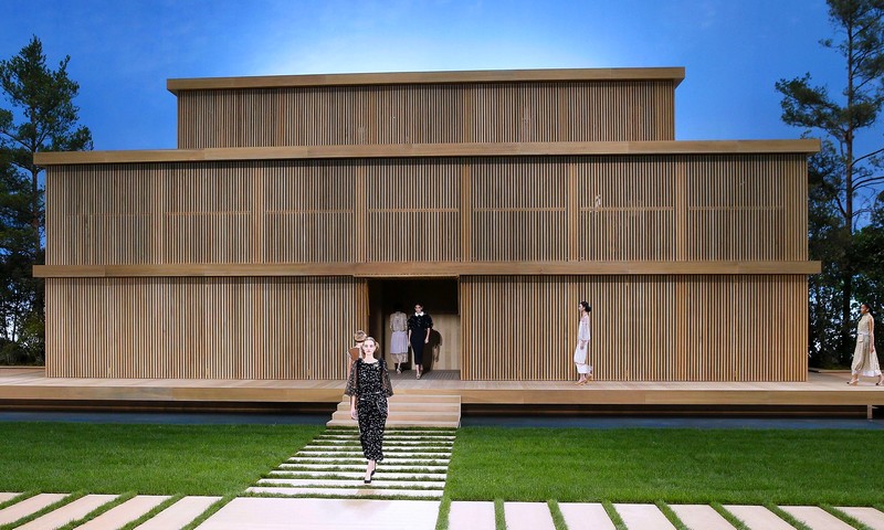 Once inside the Grand Palais on the day of the show, guests found themselves transported from the leaden skies and frenetic streets of Paris to a blissed-out, spa-like stage set, with a painted blue sky lit by floodlights and a backdrop of trees in full leaf. A minimalist pavilion in slatted wood sat in the centre of a lawn edged by paths picked out in yet more pale wood.