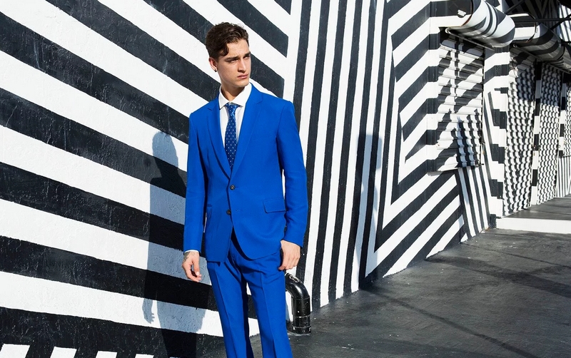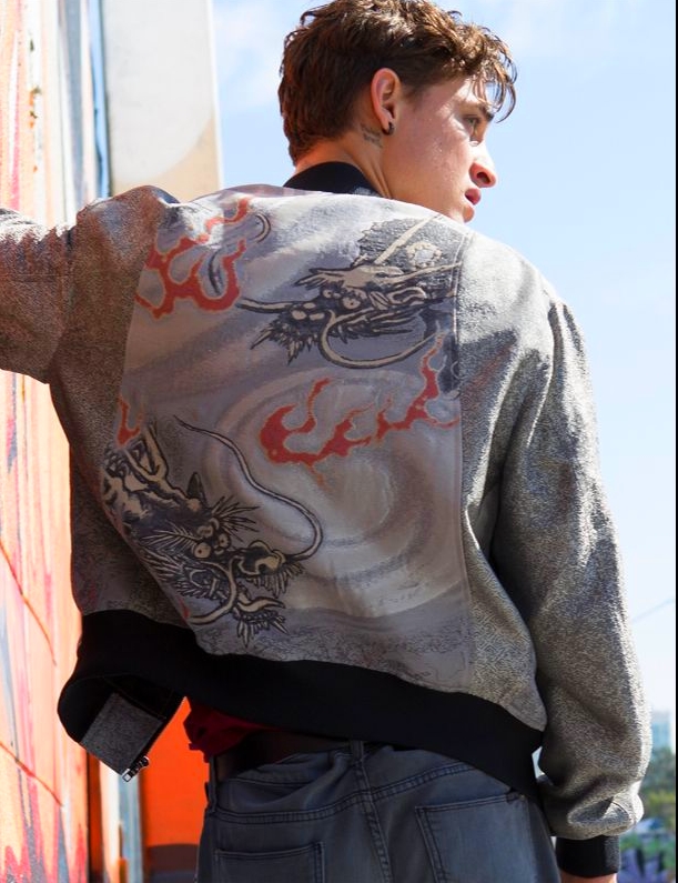 The key pieces of her collection are marine blue suits, Nishijin-ori brocade jackets, bomber jacket with dragon motif, outerwear with lining of the wind and thunder gods and neckties with selected Japanese print motifs.