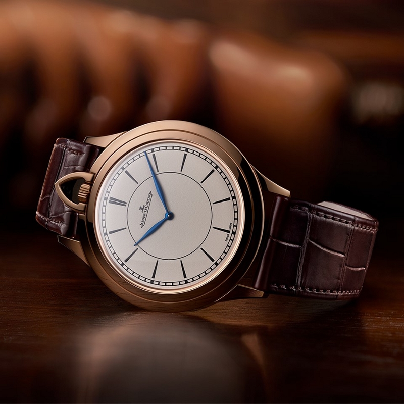 The aesthetic roots of the new watch are unmistakably those of Jaeger-LeCoultre’s traditional pocket watches: the very broad bezel slopes gently from the sapphire crystal to the edge of the case, creating a fine profile reminiscent of a knife blade and the winding crown, protected by its triangular bow, is placed at 12 o’clock. However, these timeless and traditional elements are brought right up to date with subtly modern details: simple index hour markers keep the dial refined and clean, while a finely drawn ring is repeated as a circular highlight on the bezel.
