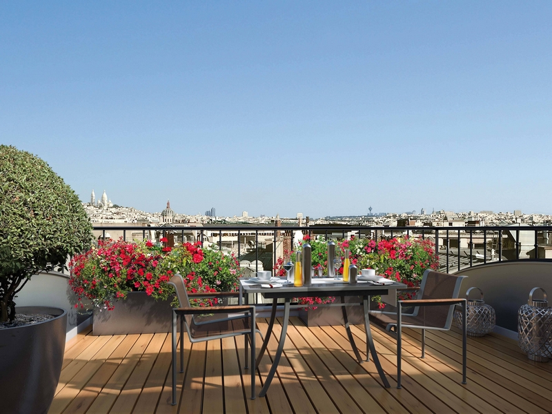 The 70 rooms, suites and apartments display a chic blend of Haussmann-era moldings and contemporary touches, including two Duplex one-bedroom apartments with terrace offering extraordinary views over Paris’ rooftops and the Sacré-Coeur. Fireplaces, moldings, chevron flooring, bookcases, everything is designed to recreate a residential feel. There is no attempt to recreate the former decor – the apartments are modern with a mix of styles and influences. The contemporary spirit of the furniture, specially designed for the property, contrasts with the classical feel of the architecture.
