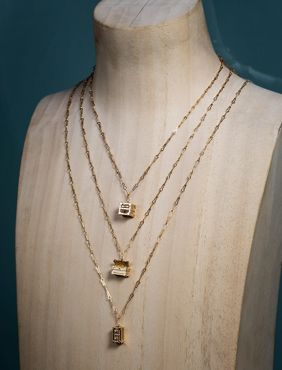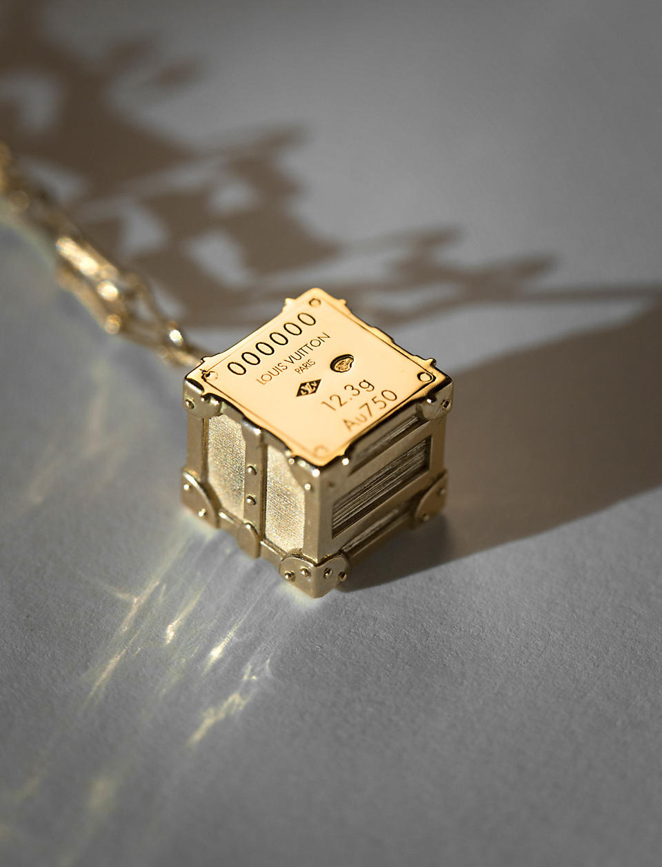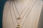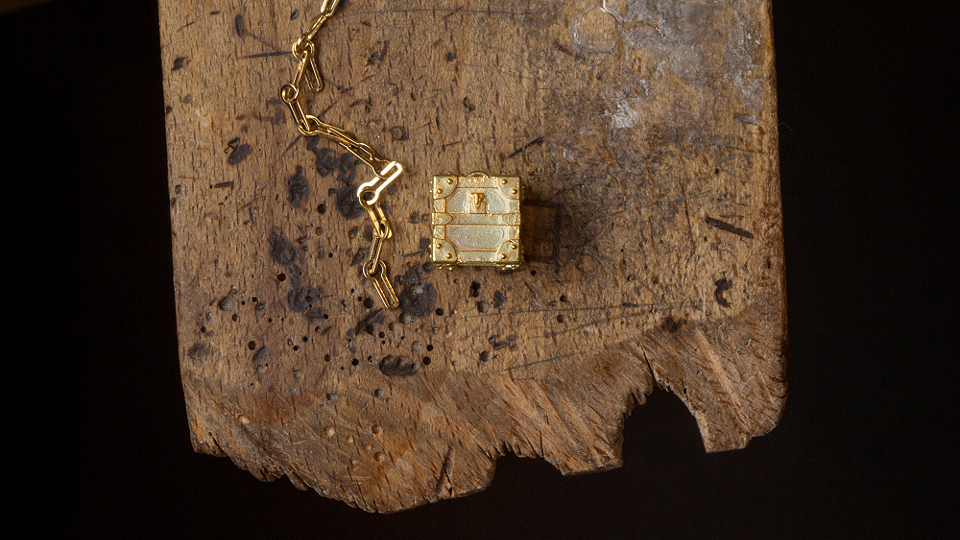 For his very first women’s collection,  Ghesquière specifically designed miniature trunks to wear as a minaudière bag and as a refined 18 carat yellow gold pendant. This new talisman reminding Lockit pendant in pink gold will dress our neckline in the form of 3 different models to choose from: an opened trunk with compartments, a cubic trunk in Epi gold, and a rectangular trunk in sandy gold.
