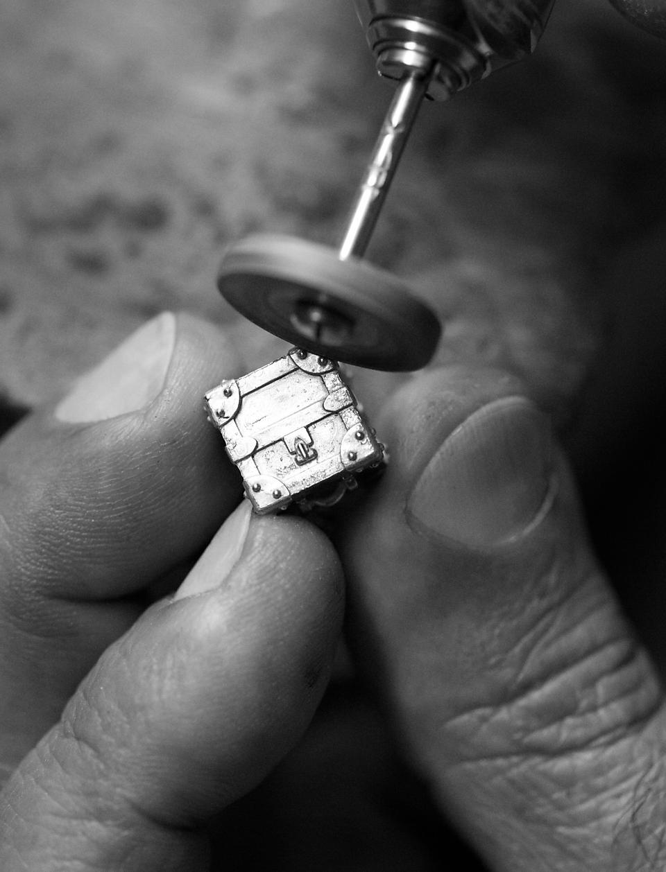 The exact design of the historical Louis Vuitton trunk, the secular emblem of the luxury House, was recreated by Creative Designer Nicolas Ghesquière & the team of artisans with thorough craftsmanship: corner pieces, nails, Epi leather effect, handles, saddles, “LV“ initials engraved, and a gold bar in the back engraved with hallmark, gold weight and composition. In his Fall 2014 fashion show, Nicolas Ghesquière paid tribute to the famous trunk, a symbol of adventure, exploration, secrets and treasures, with a fine piece of jewellery, “La Petite Malle” to wear as a distinctive pendant.