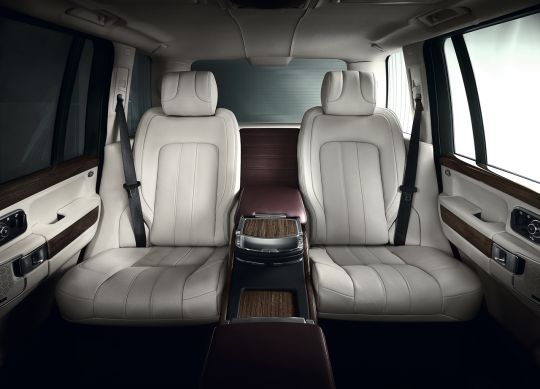 Range Rover Autobiography Ultimate Edition is billed as the most luxurious Range Rover ever.To get there, Land Rover has outfitted the new SUV model with a veritable first-class cabin that includes 4 individual buckets, separated front and back by middle console with aluminum tray tables and a drinks cooler in the back.