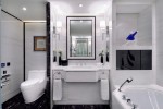 The bathroom styled in black and white veined marble offers a deep-soaking tub, rain-shower and deluxe bath products. An abstract Chinese calligraphy mosaic above the bath depicts the movements of a goldfish, inspired by the hotel’s address on Goldfish Lane in Beijing.