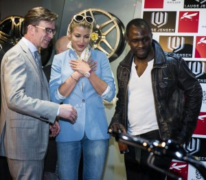 Image Shows: Afzal Kahn launches his new motorcycle in collaberation with Danish manufacturer Lauge Jensen at his Chelsea showroom, London. Seen here is’The Wire’ actor Gbenga Akinnagbe and Amy Willerton talking with Lauge Jensen CEO Frank Banke Troelsens.