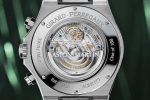 A pane of sapphire crystal, positioned to the rear of the watch, affords sight of the automatic, Manufacture movement, the Calibre GP03300-0141, marking the first time a Laureato Chronograph features an open caseback. This movement, based on the highly regarded Calibre GP03300, is endowed with Côtes de Genève, in both circular and straight forms, polished sinks, thermally blued screws and perlage. The movement also bears the eagle emblem, signifying it is an in-house calibre.
