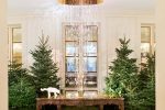 The experience begins with Christmas trees lining the exterior entryway and leading indoors to a potted pine forest — all consciously lit with eco-friendly candles or LED string lights. The lobby, Socrate’s customary domain, is illuminated by a cascade of 500 crystal pendants to be draped from the ceiling, casting its infinite reflection on the surface of a mirror topped central table. The surrounding pines, decorated in gold baubles and white tassel ornaments, feature beautifully wrapped gifts at their base.