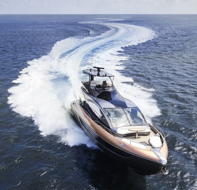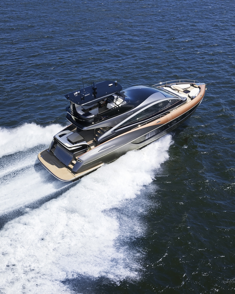The LY 650 flybridge cruiser retains the vibrant form and beautiful curved lines of the Lexus Sport Yacht Concept and is both elegant and sporty. Its strong and pronounced bow, and dynamic hull boasting one of the widest beams in its class, swiftly reveal the presence of a LY 650, while its coupe-like roofline and accentuated aft hips stress the high level of its cruising performance.