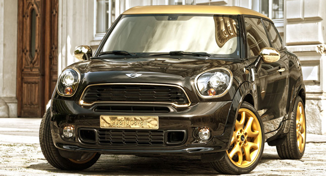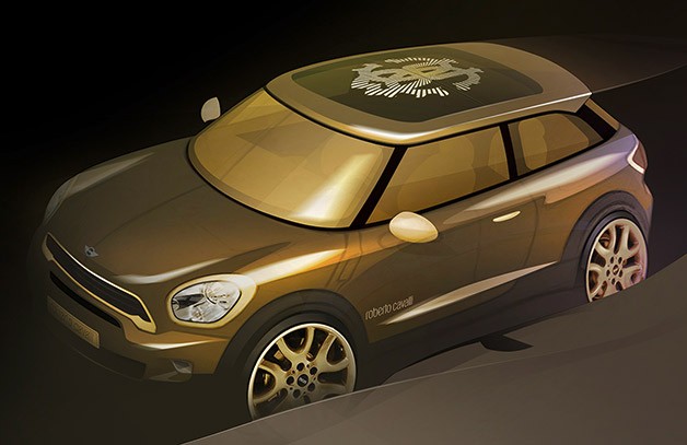 Cavalli upgraded the exterior of the MINI Paceman – the youngest and seventh member of the MINI family – with an exclusive colour that has already featured in his own fleet of cars: a special iridescent paint that shimmers between black and brown depending on the incidence of light. Cavalli logo on the roof of the car along with his signature on the wide coupé door leave no doubt as to the designer who has left his unmistakable imprint on the car. The logo can also be found on the inside, where the headrests and sun visors feature the stylish motif. The interior design of the MINI Paceman is swathed in black, with individual gilded elements – such as the decorative stitching on the leather seats and the MINI Center Speedo surround – lending it an extravagant look. This is further reinforced by the hallmark Cavalli animal prints on the leather-lined steering wheel and parts of the instruments.