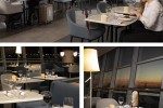 In this area located on the mezzanine, new furniture and imitation leather couches, inspired by a Parisian brasserie, have been custom designed to offer a convivial atmosphere. Blue and grey tones along with atmospheric lighting have been added to create a more intimate atmosphere. The mezzanine floor has also been redesigned, incorporating light and anthracite grey shades. In total, the area is equipped with close to 34 tables for 2, a high table with 6 seats for dining opposite the runways and a round table seating 6.