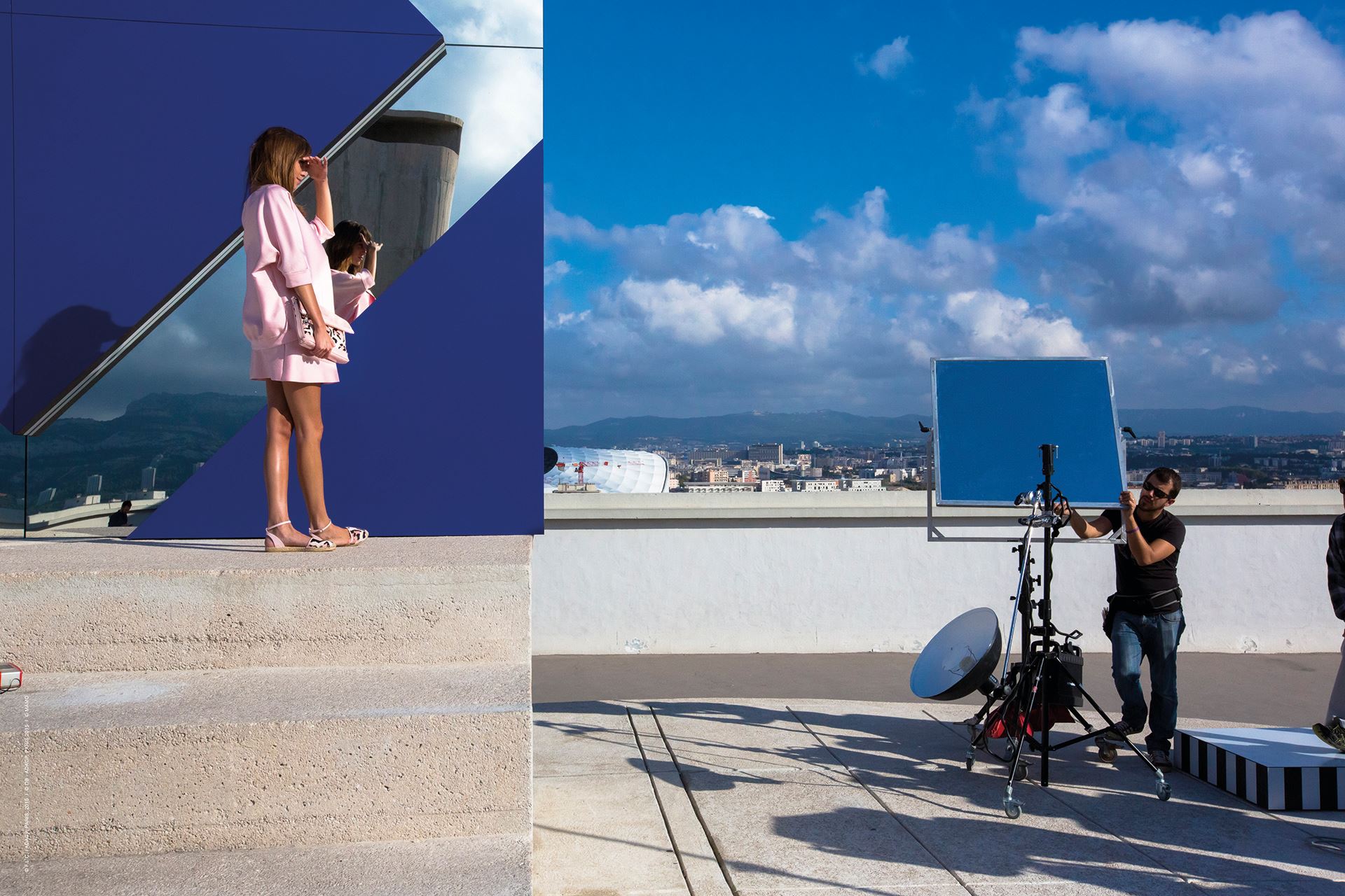 “The work of Buren is a great match, and with such strong images, it’s very appealing to shoot. It’s true that the interaction of the play of mirrors and Alexa Chung with the Longchamp Bags and ready to wear meshes perfectly with the exhibition and the colors. It creates a very strong graphic language.” said Designer Ora-Ito, the creator of MAMO Marseille.