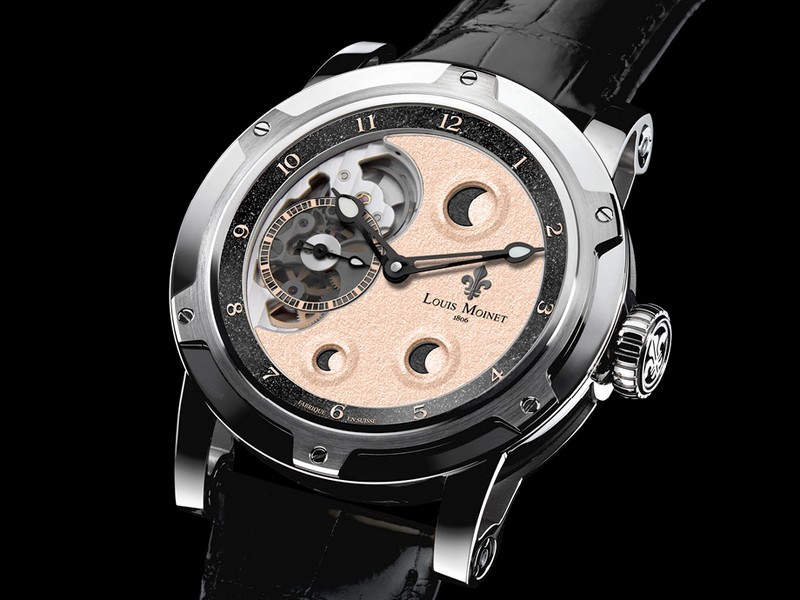 The unique timepiece sports a gold-plated dial, for which the firm has performed another first in terms of decoration: its face is first gilded – and then hand- punched to form lunar ‘craters’. And to complete the metaphor, Ateliers Louis Moinet has filled these craters with genuine fragments of lunar meteorites.