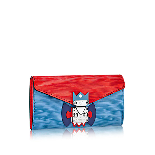 The envelope-style Sarah Wallet in iconic Epi boasts a unique Tribal Mask design for its closure. The ingenuous interior features a variety of pockets and credit card slots.