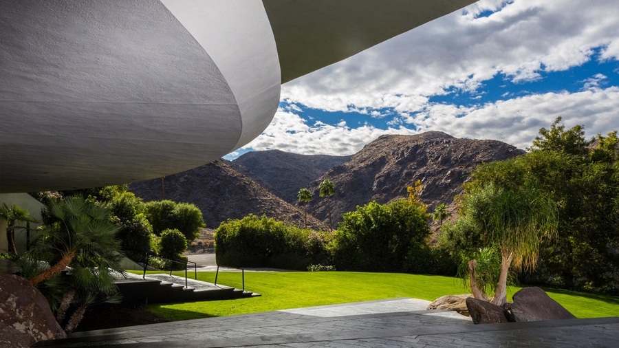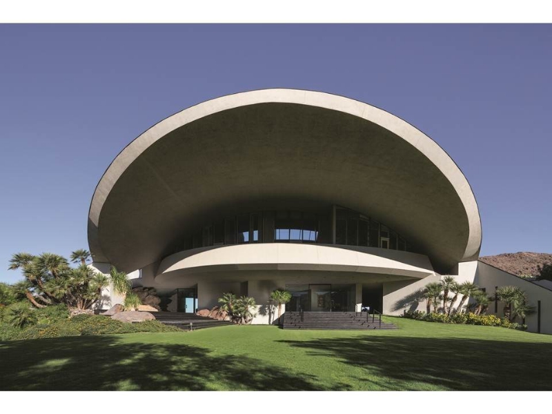 A legend among Palm Springs estates, it is also famous for its major architectural interest, so characteristic of Desert Modernism. The estate was built to resemble a volcano, with three visor-like arches and an undulating concrete roof, a hole at its center opening a courtyard to the sky.