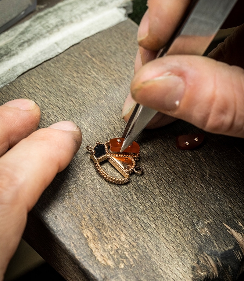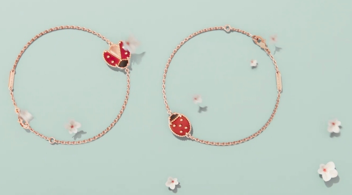 A long necklace, three bracelets a clip and earrings portray joyful ladybugs, along with flower and leaf motifs. Blending rose gold, mother-of-pearl, carnelian and onyx in delicate harmony, the new 2021 collection adds a new and vibrant touch to Van Cleef & Arpels’ enchanting garden.