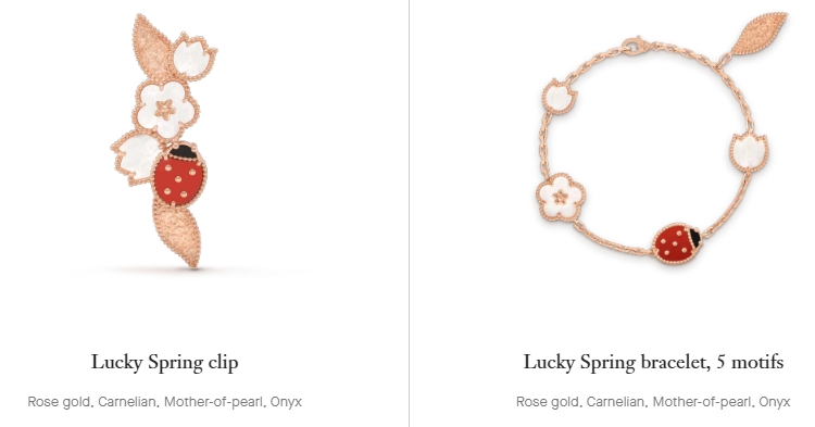 Like an invitation to celebrate nature’s rebirth, ladybugs, leaves and flowers joyfully frolic on the long necklace and the five-motif bracelet. A sign of consummate attention to detail, fine golden pistils glimmer in the heart of the plum blossoms, while the mother-of-pearl corolla harmonizes with the nacreous sheen of the lilies of the valley. The pieces are interspersed with tasseled leaves in textured rose gold, delicately reflecting every movement.