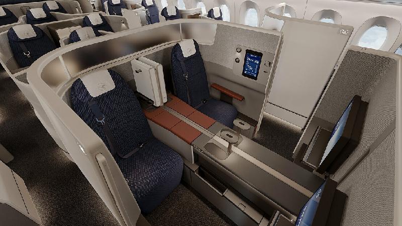 High seat walls and generous shoulder space provide greater privacy in all options. The seats can be converted into a bed at least two meters long and also offer high-definition screens (4K), generously-sized dining tables, wireless charging, noise-canceling headphones and Bluetooth connectivity. All seats are also equipped with a heating and cooling system, giving business class travelers the flexibility to set their own temperature. For extra comfortable side sleeping, seats also feature a shoulder sink-in, allowing the shoulder to sink into the seat, increasing sleeping comfort for side sleepers. A tablet-sized control unit provides access to all seating, lighting, heating/cooling and entertainment functions. Naturally, each seat is directly accessible from the aisle.