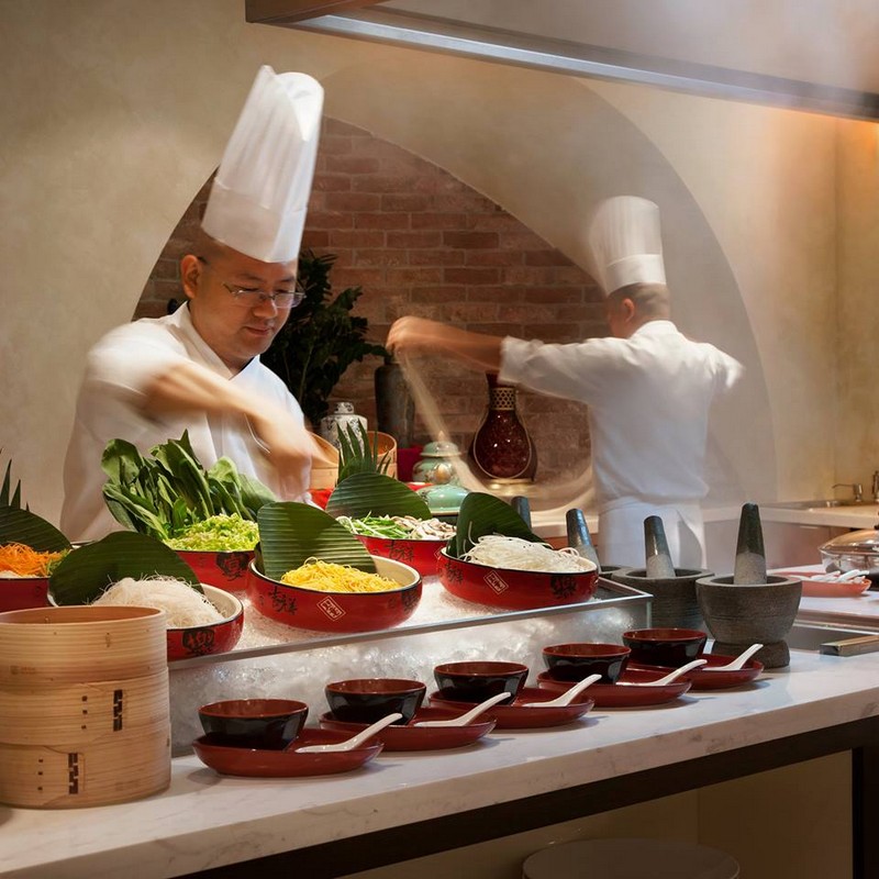 Shangri-La Hotel, Doha captures the essence of international dining options with seven food and beverage outlets. Sridan provides an interactive all-day dining experience where distinctive arches, intricate lamps and vividly coloured tiles recreate a lively souq (market) atmosphere for guests.
