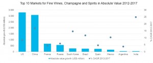 top 10 markets for fine wines, champagne, and spirits in absolute value 2012-2017