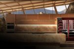 The JennAir Burlesque column pair lives in a cavernous, natural form environment, as envisioned by Kelly Wearstler. Rugged stone and wood textures, paired with amber-hued copper, offset the refrigerator’s bold burgundy interior. The design is punctuated with rocky outcroppings inspired by the Southern California desert.