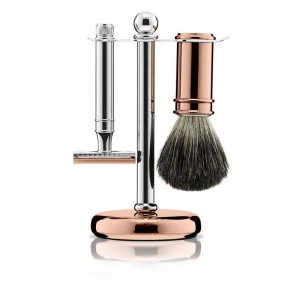 Chrome & Rose Gold Plate 3 Piece Shaving Set and a Leather Wash Bag made exclusively by Ettinger