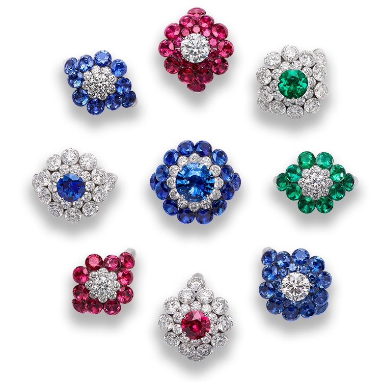 Magical Setting Haute Joaillerie offers a choice of jewels set in white diamonds, sapphires, rubies and emeralds. Each cluster is centered on a significant single stone and encircled throughout with unusually large precious stones.