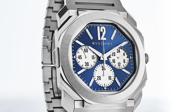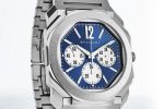 The new Bulgari Octo Finissimo S Chronograph GMT timepiece comes in satin-polished steel with a new blue sunray dial paired with the silver counters, for a more sport chic look. Reaffirming the sportier character of the Octo Finissimo S line, the watch features a larger screw-down crown, ensuring water resistance up to 100 meters.
