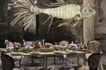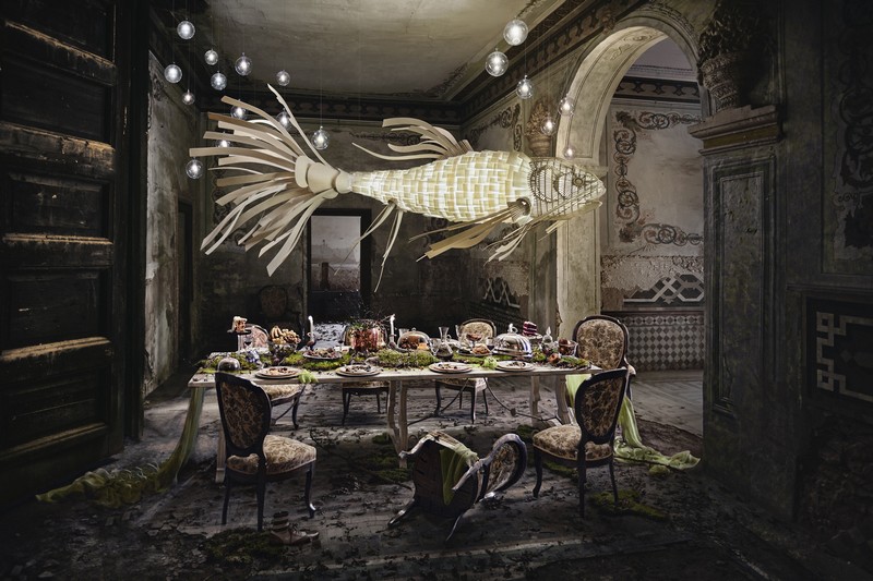 The mighty Koi hangs in splendour over a fabled dining scene that is strewn with the remnants of a magnificent feast. The Elephant stands upright and tall, doubtlessly curious about the bunnies running around its feet. The friendly Fish with legs perched by a billowing curtain, as though having just made a grand entrance. And with LZF’s premise that dreaming is very much like walking barefoot, notice the discarded shoes in each picture.Dreams tease and tickle, taunt and torment.
