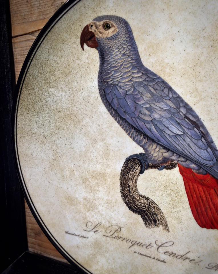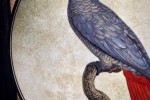 Ink pen, film and silk frame are the method used for the development of the color composition of each parrot. Each film represents a color. The china draws the positive tone of color and the imprinted light marks, on chassis, the track of each color. The films, in an extraordinary game of overlaps, create and complete the decoration, characterizing the decorum with the harmony, variety and beauty of tone.