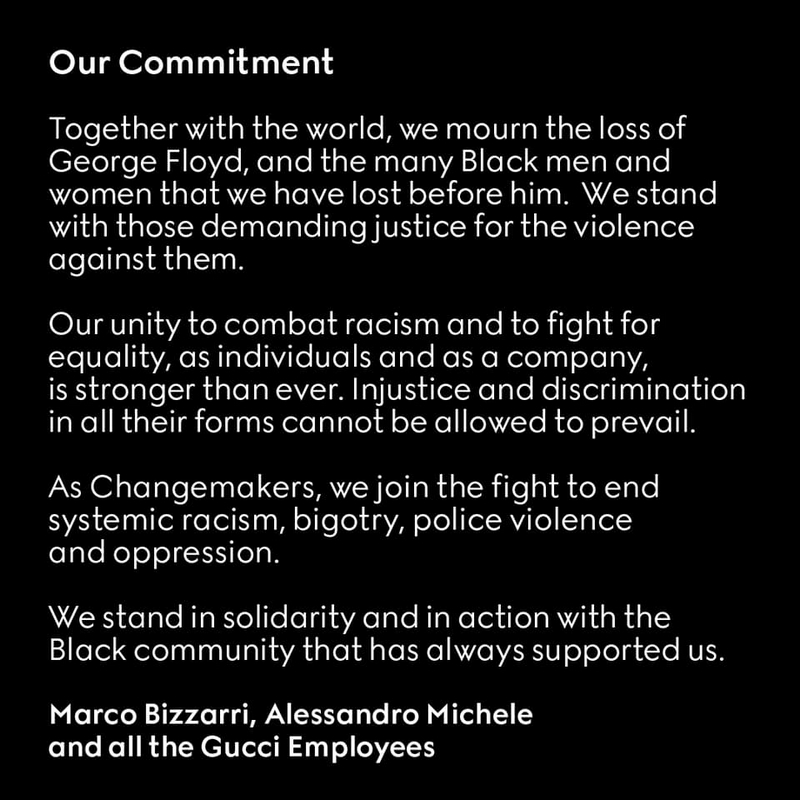 Gucci, Saint Laurent, Bottega Veneta, Balenciaga, Alexander McQueen, Brioni, Boucheron, Pomellato, Dodo, Qeelin, Ulysse Nardin, Girard-Perregaux and Kering Eyewear acknowledge that words alone are not enough and want to contribute to organizations focused on combating systemic racism and ending police violence towards the Black community in the United States.