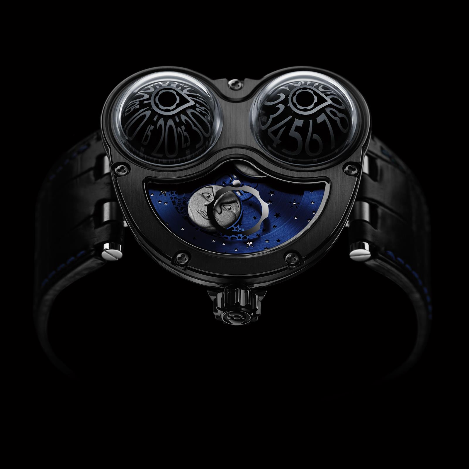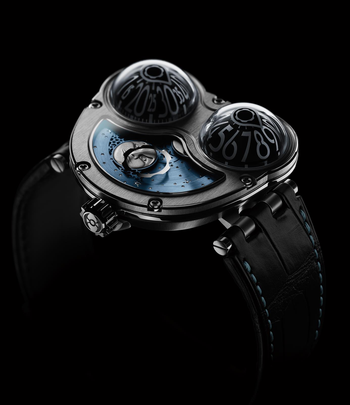 To create MOONMACHINE, Stepan Sarpaneva has reconfigured HM3 Frog by 90° and added his iconic moon- face moon-phase indicator complication set in a scintillating firmament of northern stars.