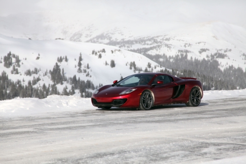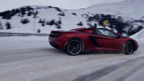 McLaren 12C Spider challenges a snowboarder