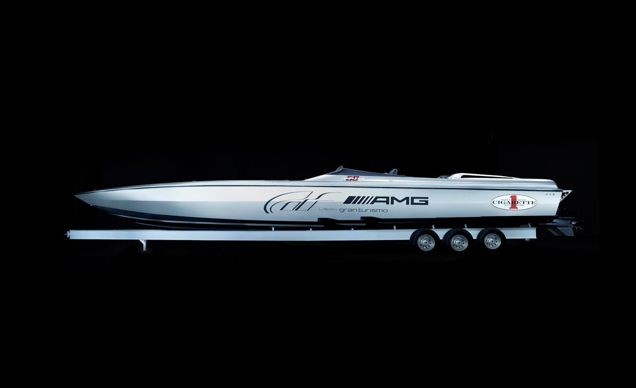 Cigarette Racing and the Mercedes-Benz high-performance brand AMG joined forces for the fourth consecutive year to present futuristic visions of the Mercedes-Benz AMG Vision Gran Turismo Concept car and the floating fantasy called Cigarette Racing 50′ Vision GT Concept, the most powerful production twin engine performance boat ever developed and built by Cigarette Racing.
