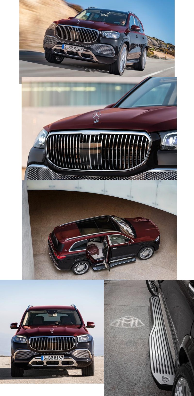 The 22 or 23-inch wheels were developed exclusively for this model, with the 23-inch version echoing the pinstripe theme. The tailpipe trim elements with a small cross rib emphasise the model’s identity as a Mercedes-Maybach. The same applies to the brand emblem, which is positioned at various points such as on the D-pillar. As a special, Maybach-specific feature, two-tone paintwork is planned in eight different colour combinations.