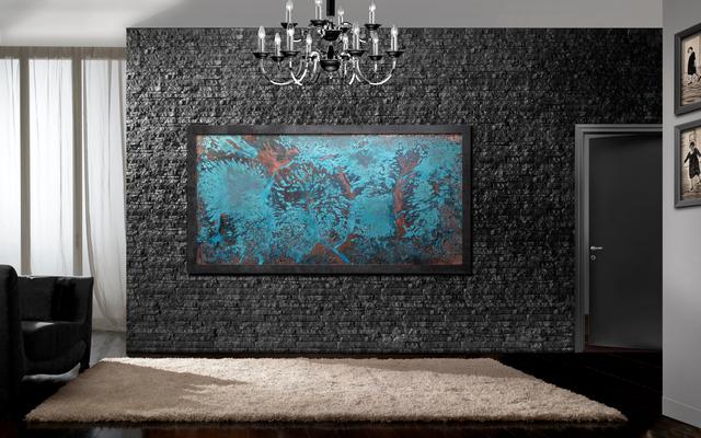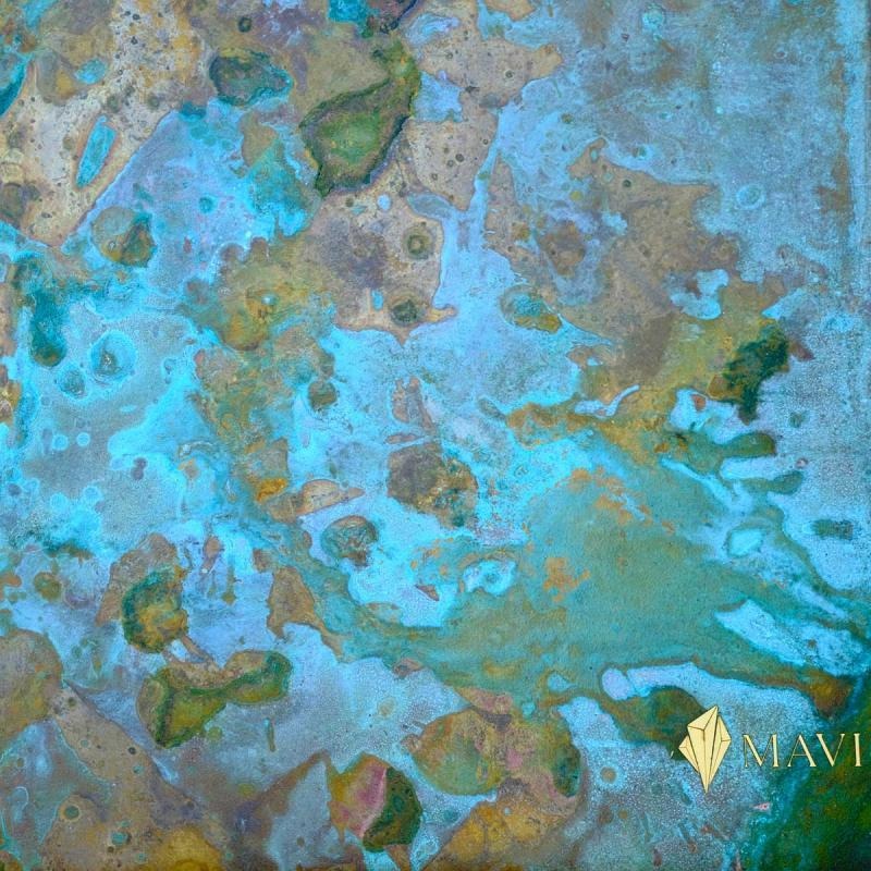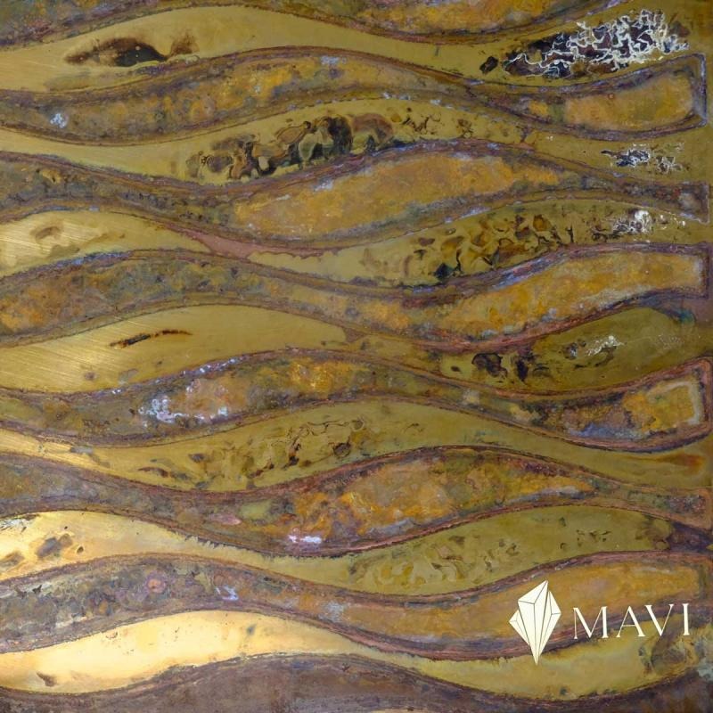 The slabs of the MAVI and MAVI CALYPSO collection obtained from Copper are heterogeneous and testify to the most disparate contexts. Sometimes, if the prevailing color is the copper itself, supported however by the shades of yellows, ochres, rye yellow or zinc or ivory, the pictorial picture will be close to hay as well as to the bucolic contexts a little pleasant of Virgilian literature, or again to the autumnal trunks that turn yellow at the top. These two collections based on the same principle differ in size (Mavi: 1h x 2L in meters; Mavi Calypso: 48L x 197h cm) and all belong to the project, symbolically and creatively renamed Metal-morphosis, both having a decorative wall function: the Mavi Calypso then being tapestries are also adaptable as dividers.