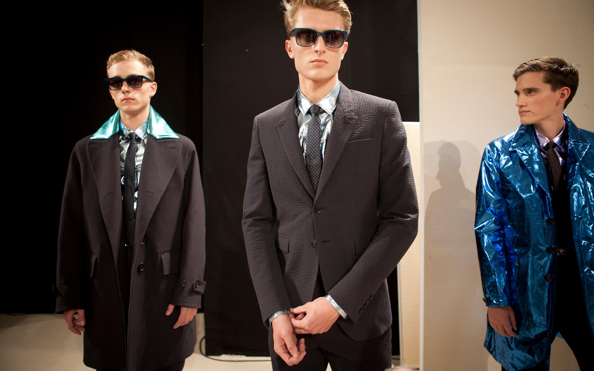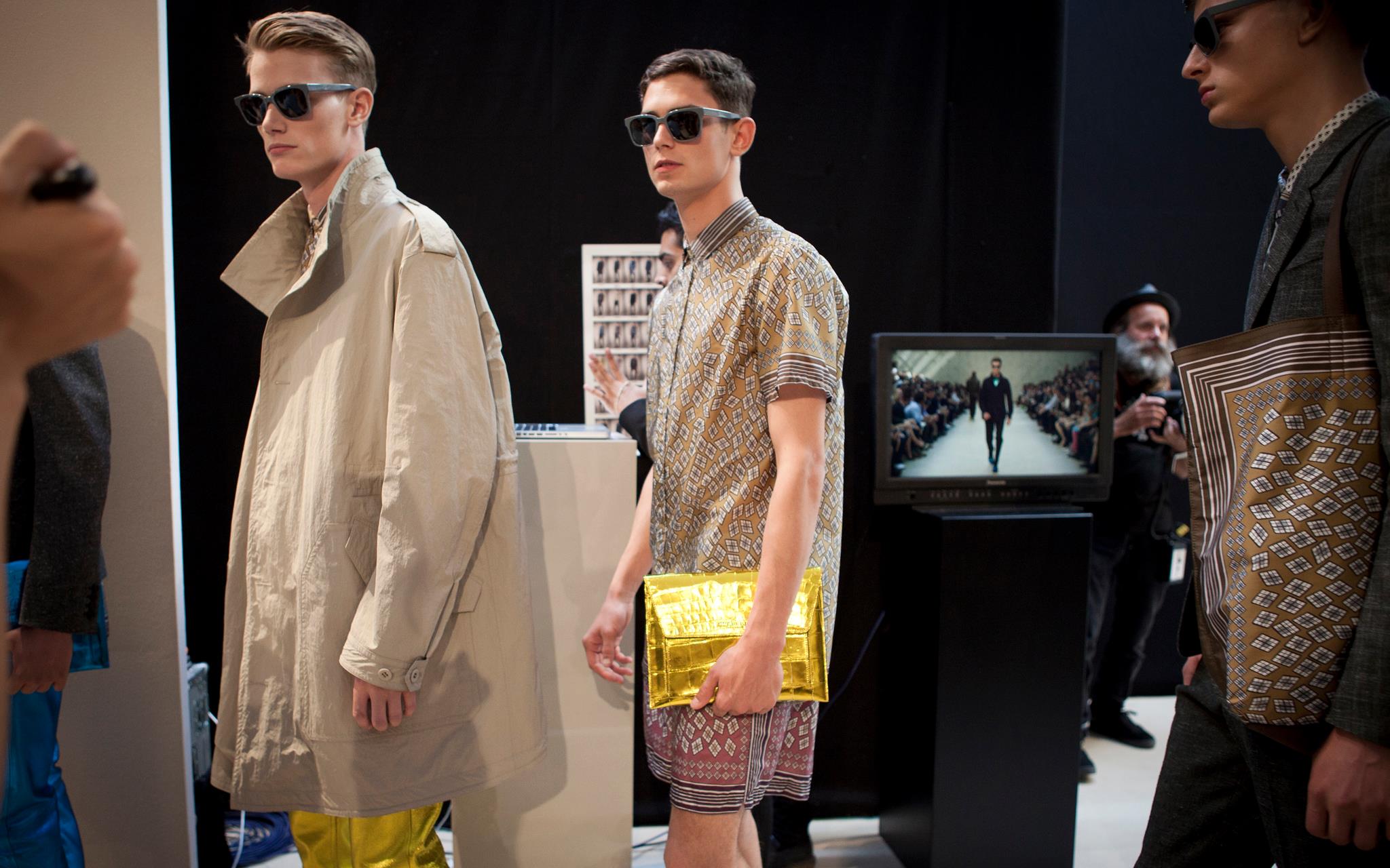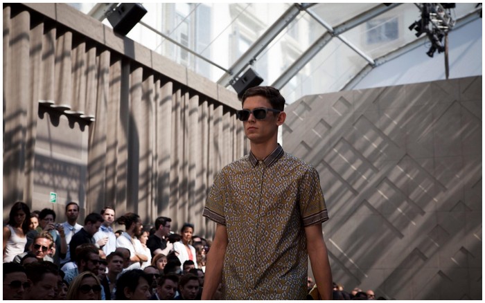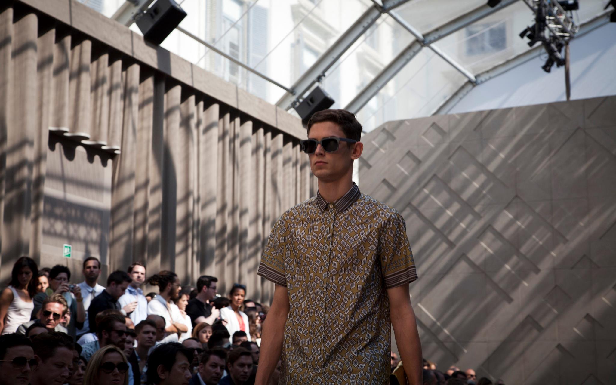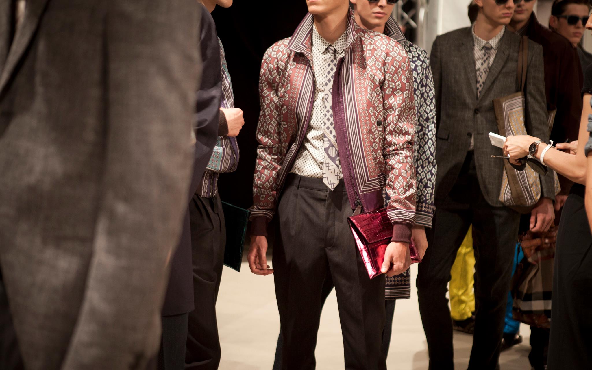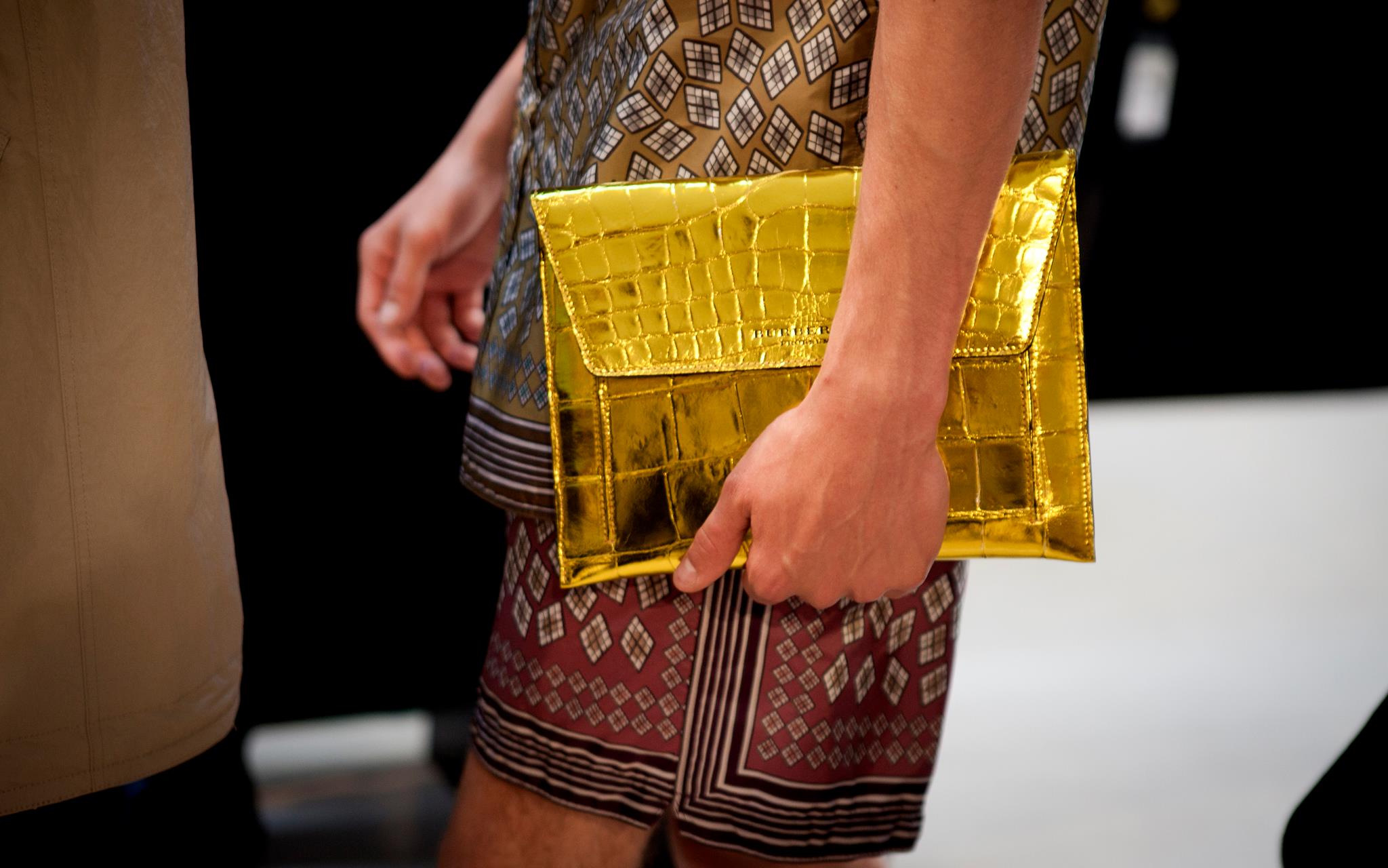Burberry tailoring, plus vibrant geometric prints, metallic petrol blue iPad cases, day glow shirts and splash sunglasses will compose Spring Summer 2013 menswear wardrobe. Christopher Bailey adds a touch of metallic finish and a adds a little bit of glitz in menswear ensemble.