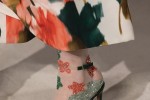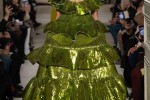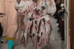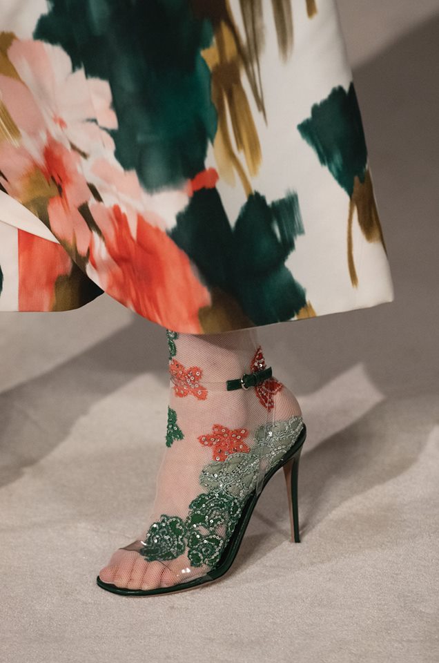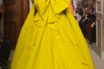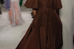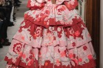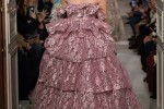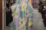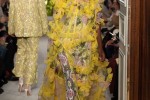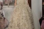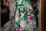 “Ortensia blu”, the violet wrinkled organdy dress, decorated with volants and papillonnant, is eclipsed by the “Azalea, Margherite, Rovi” – a nude gauze dress with emerald, fuchsia and ivory ramage applications and the Ajouré matching cape. The cape dress – the hero of the show features floral prints, medallion with volants, and lace combinasion.