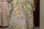 Cocoa tulle rangé is overlapped by argenté rose lace on the Dalia Rosa bustier dress. “Magnolia” bouton gold organza cape dress features a magnolia print, medallion with volants, and a lace combinasion.