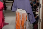 The “Strelizia, Iris” look featured a lavender asymmetric cashmere dress, pearl crêpe T-shirt and parme georgette budellini, orange wool and silk wide trouser.