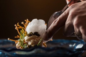 Pickled Japanese mackerel and caviar, served over smoked cheese, featured on the Next Ancient Rome menu