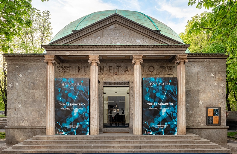 For its second year exhibiting at the Milan Design Week Fuorisalone, Bvlgari took over a 1,000-square-meter space in the heart of the Indro Montanelli public gardens, displaying two installations that explore connections between design, science and art. The first installation in the Ulrico Hoepli Planetarium featured the work of Argentine artist Tomás Saraceno. The second, in the gardens around the Planetarium, immerses visitors in the story of the B.Zero1, the iconic Bvlgari jewelry design that fetes its 20th anniversary this year.