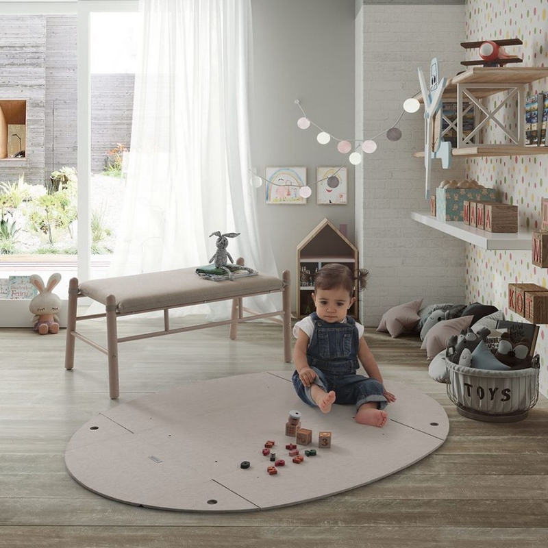 The carrycot, separated from the base, can be used as a toymaker independently. In addition, its ingenious folding system – similar to the origami paper folds, allows it to be deployed and converted into an oval, insulating and very pleasant to the touch carpet.