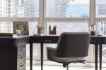 The pieces are crafted from natural and sustainably sourced materials. The timeless modern Alba Collection combines a dark oak finish and brushed stainless steel hardware with vegan leather accents. The elegantly curved, fashion-forward Ella Collection features oak in a brushed white finish with champagne brass details. And a third desk chair option, the executive-style Eva Chair, features rich Italian leather and a distinctive openwork metal base.