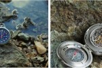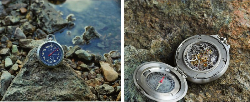 The pocket watch can be positioned on a table with a stand or combined with an in-built compass that can be accessed by opening it up to lay flat on a map for planning adventures.